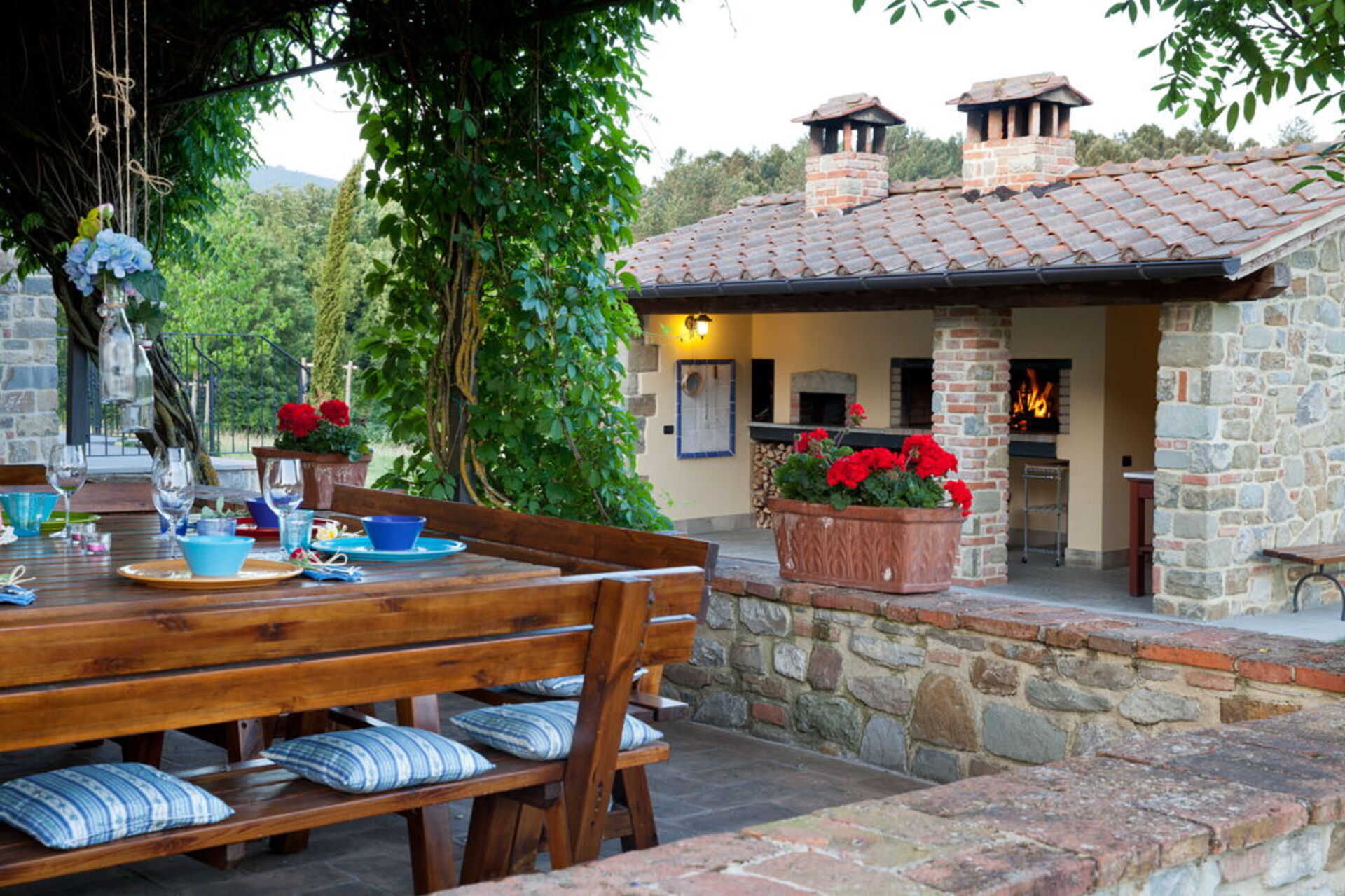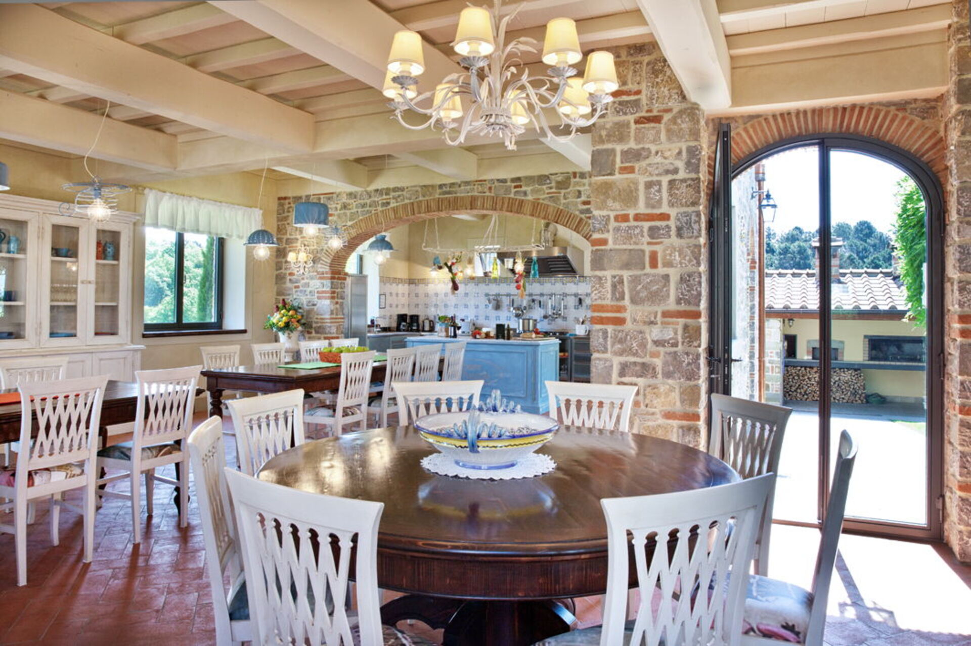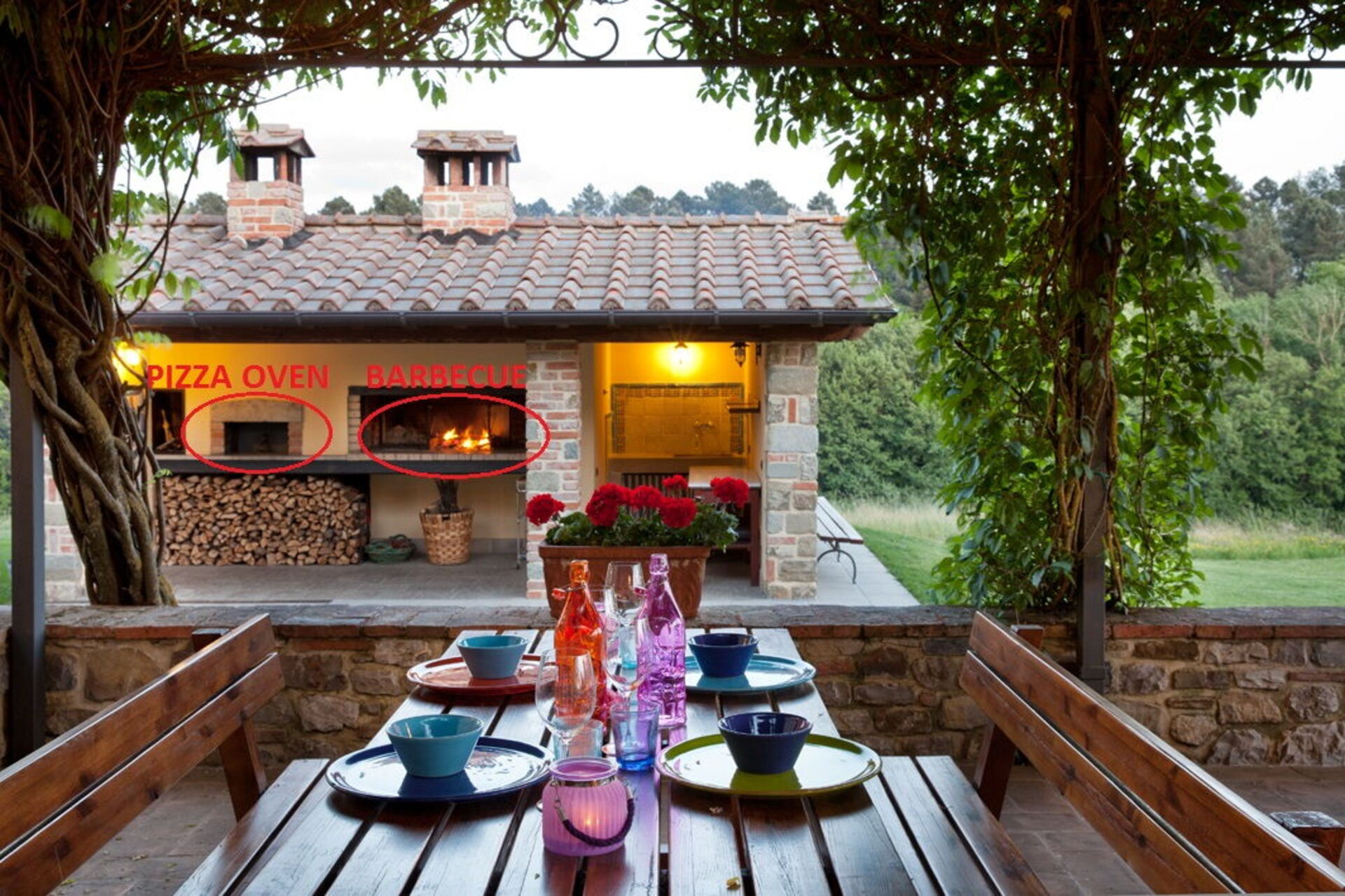 In the common annex, located in the center of the garden, you will find a large dining room with a fully equipped kitchen. The property also has a terrace covered by a pergola equipped with tables and chairs which also leads to the wood-burning oven and the barbecue area.