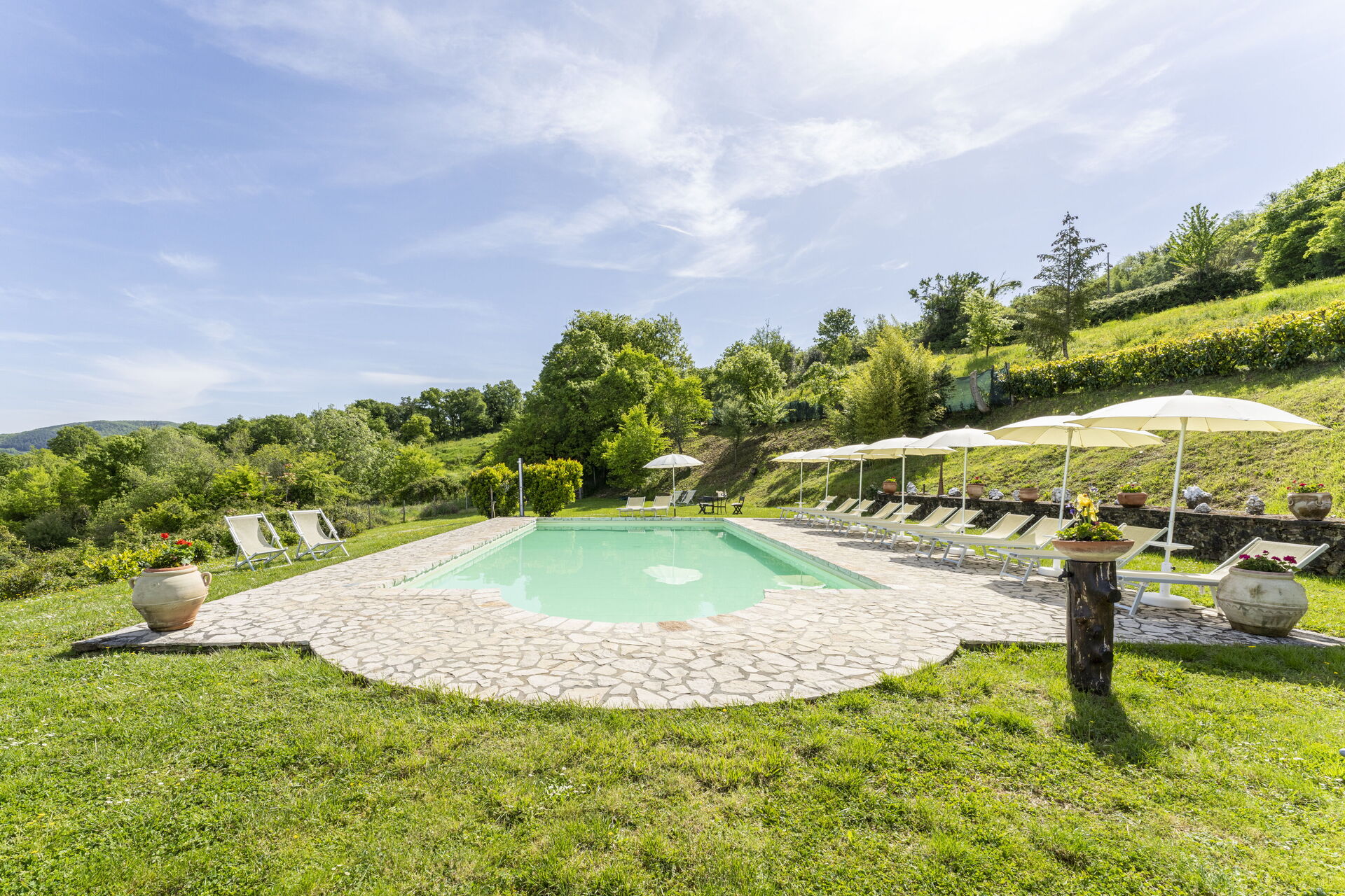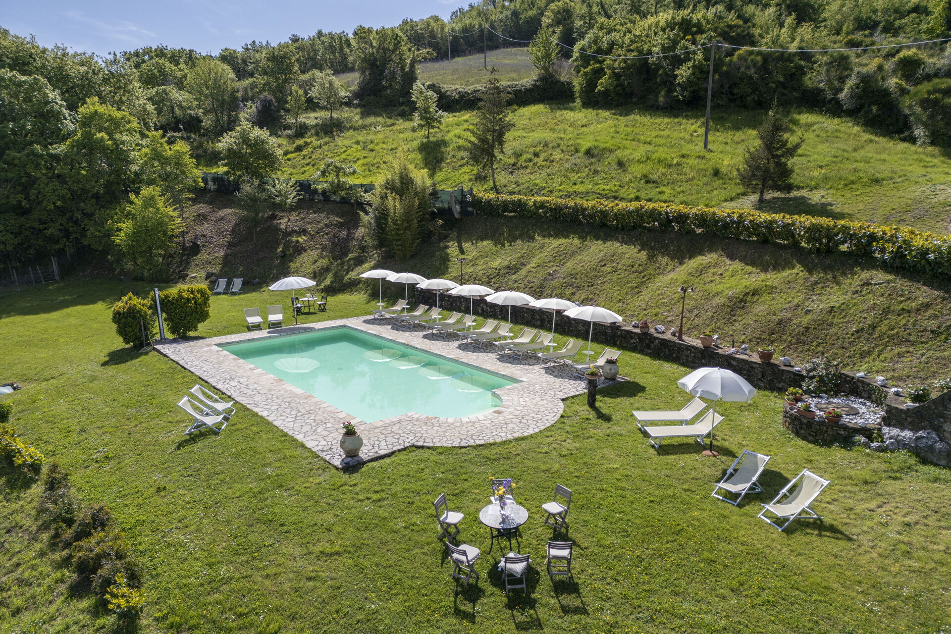 The exterior of the farmhouse is characterised by a large garden where you will find the beautiful 72-square metre swimming pool, shared, overlooking the surrounding hills.