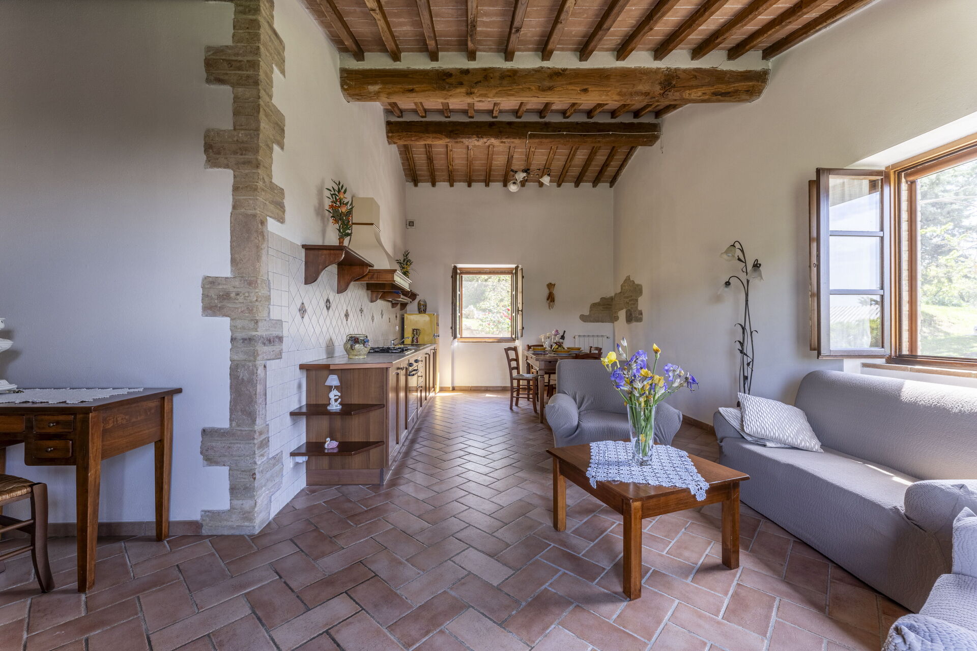 On the ground floor is the kitchen-living room, a beautiful living area furnished with sofas, a fireplace, table and chairs and a well-equipped kitchen. There are also two bedrooms: one with a double bed and one with three single beds. There is a bathroom with shower.