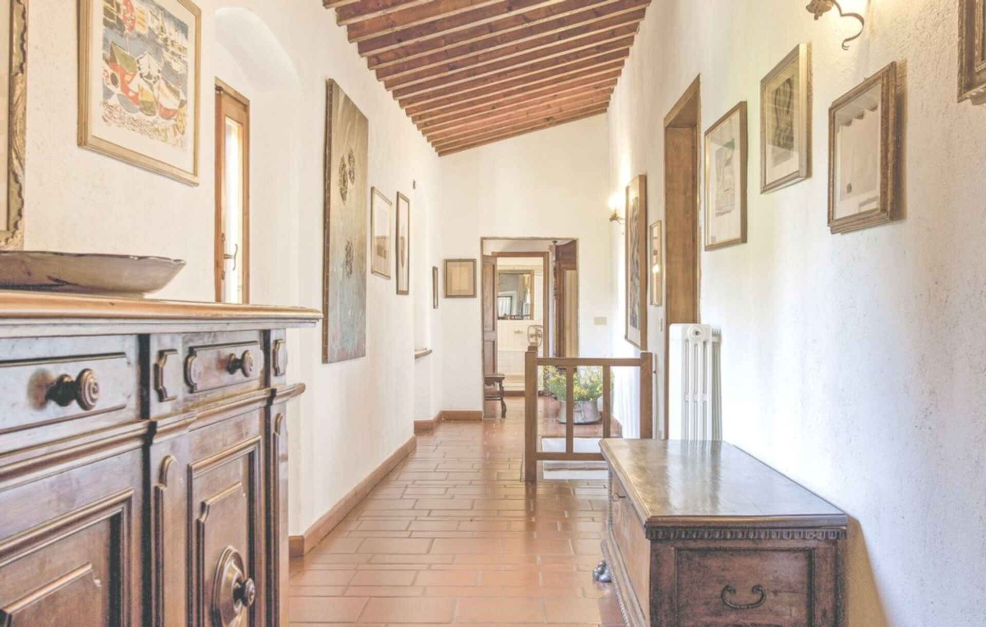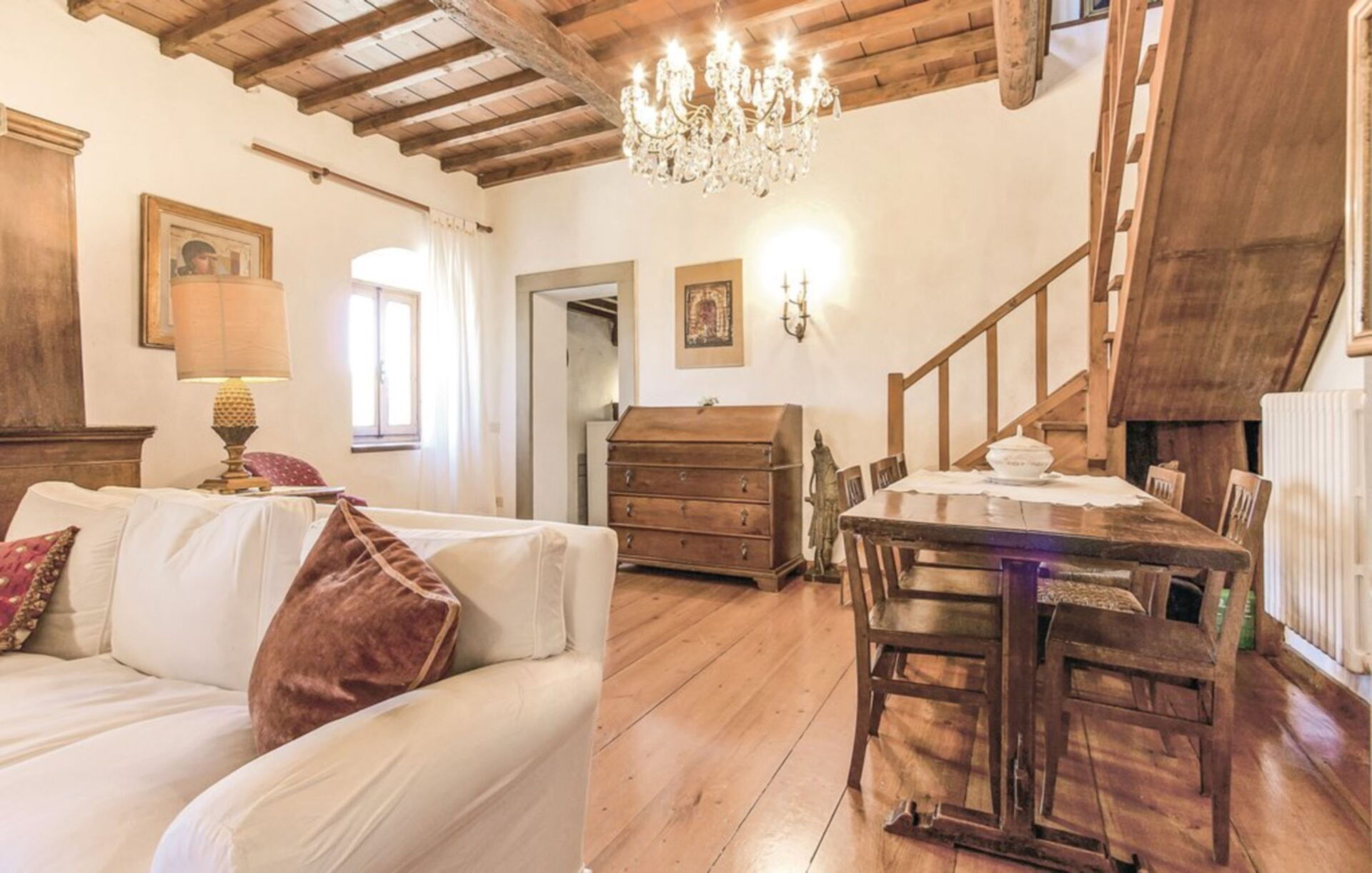 On the ground floor: large living room with fireplace (not working); characteristic kitchen / dining room with large fireplace with four burners, oven, fridge freezer, dishwasher and washing machine; 2 double bedrooms; 1 bedroom with two single beds; 1 bathroom with bath (toilet / bidet); 1 bathroom with shower (toilet / bidet);