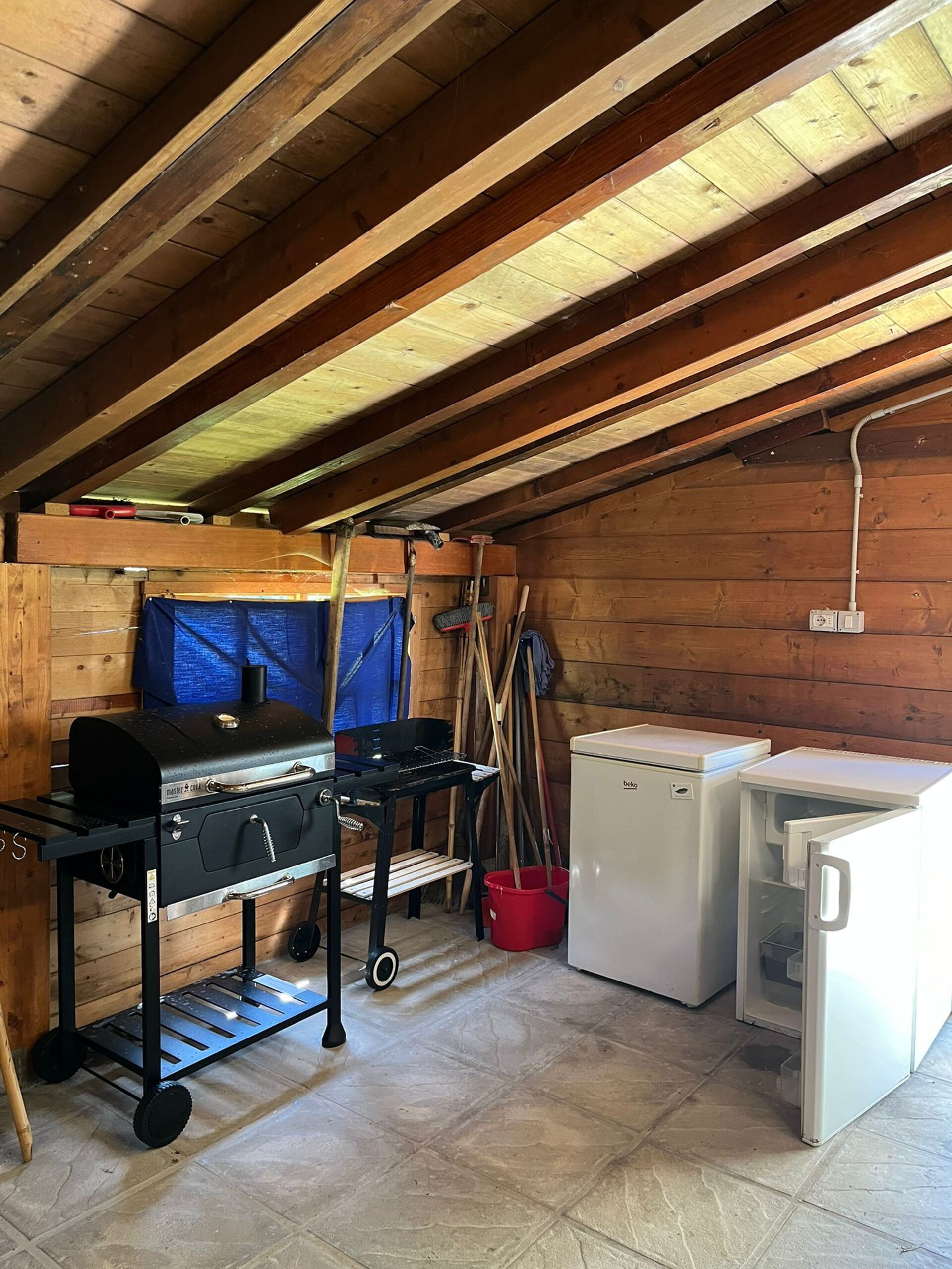 Laundry room accessed from the exterior, with washing machine, drying rack, iron and ironing board, small fridge and small freezer.