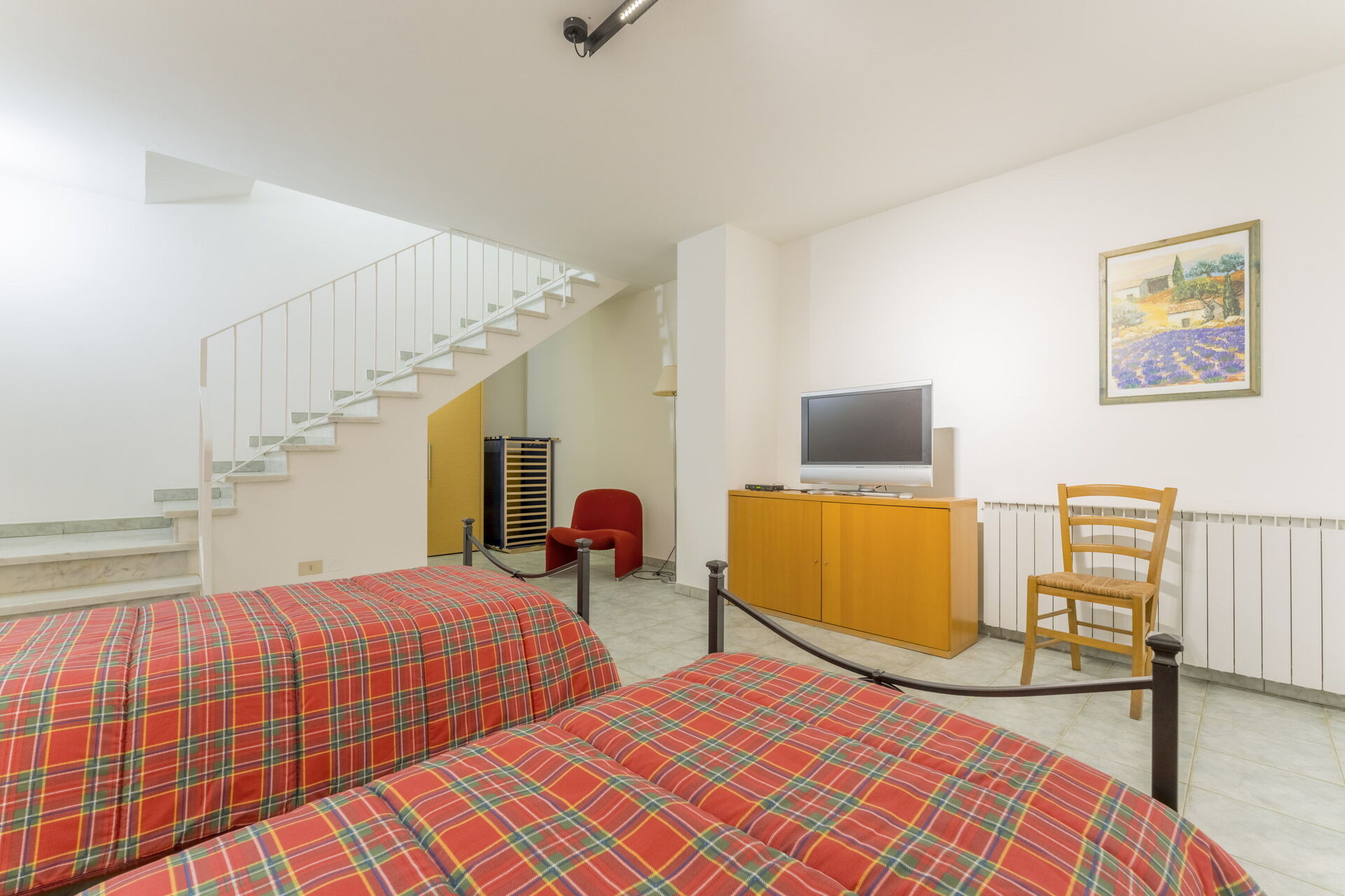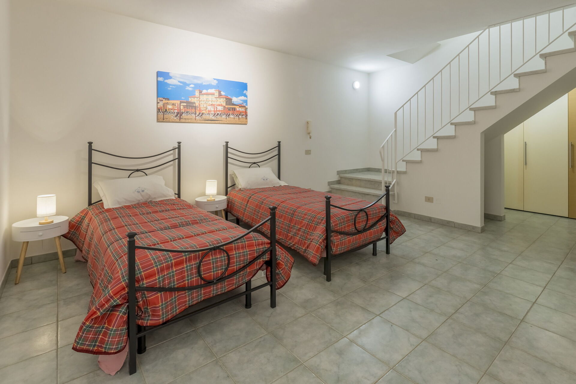 Going downstairs you will find a room with two beds and a built-in wardrobe.