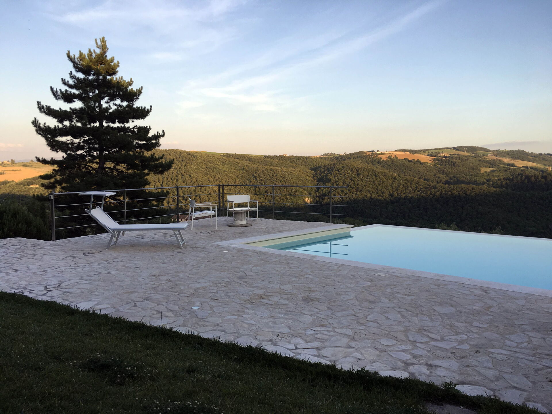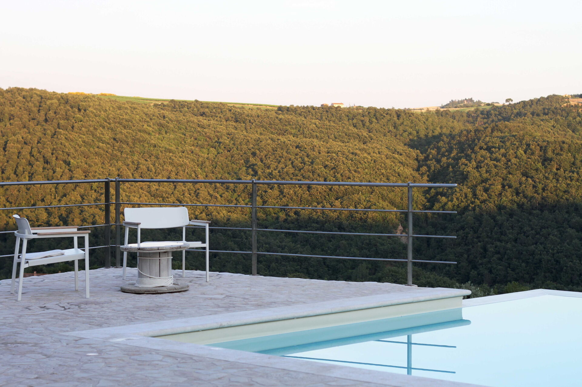 This sublime villa has recently been completely renovated with the total recovery of an old farmhouse in Umbrian-Tuscan style from which wooden planks and parts of the trunk were also recovered and then reused to make benches and stools for bedrooms and bathrooms. Outside, in addition to the wonderful view, you can immerse yourself in a dream by diving into the large infinity pool. This is one of the most beautiful corners of the property with its infinite view over a sea of evergreen hills and mountains.