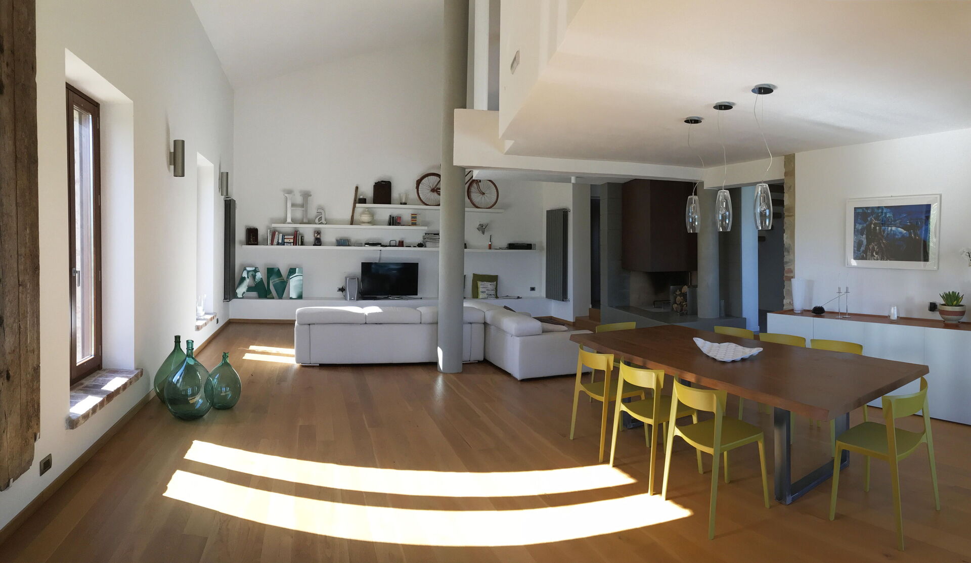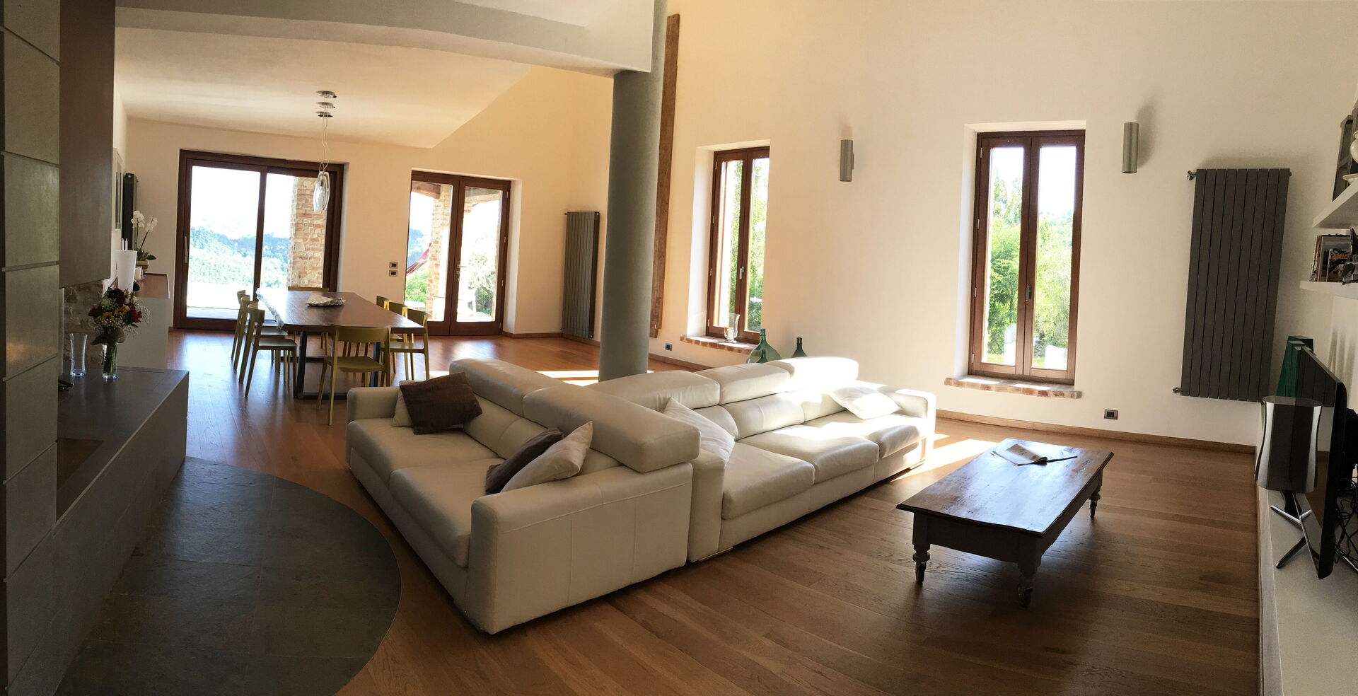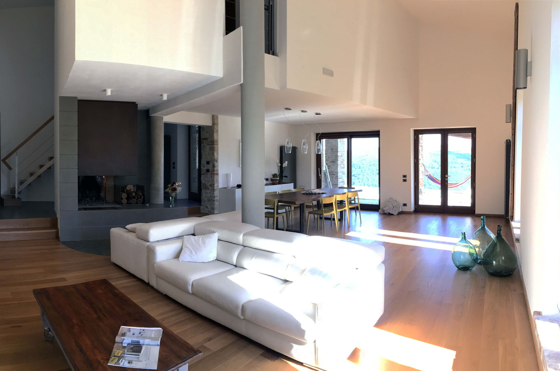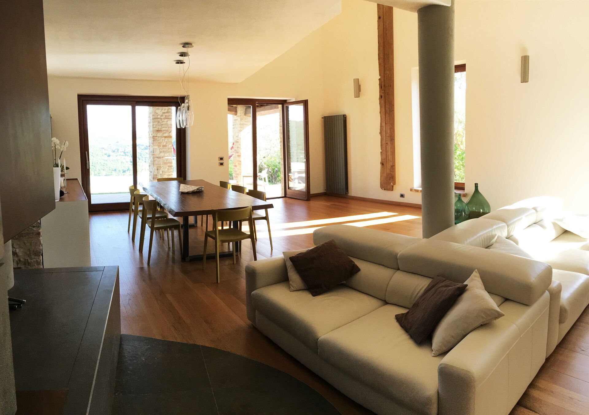 The villa can accommodate up to 10 people, having 4 double bedrooms, one of which also has a sofa bed. The bedrooms are all with king size beds and private bathrooms. A fifth bathroom serves the living area where a large living room with a very particular structure will welcome you. The living room, with two large sofas and a fireplace where you can enjoy a few hours of relaxation even on the coldest days, is a unique construction of its kind where the lines of a large space with very high ceilings are cut by columns and large openings towards the 'external. The many windows offer an enchanting view of the valley where the colors of the foliage of the olive trees and the surrounding hills dominate.