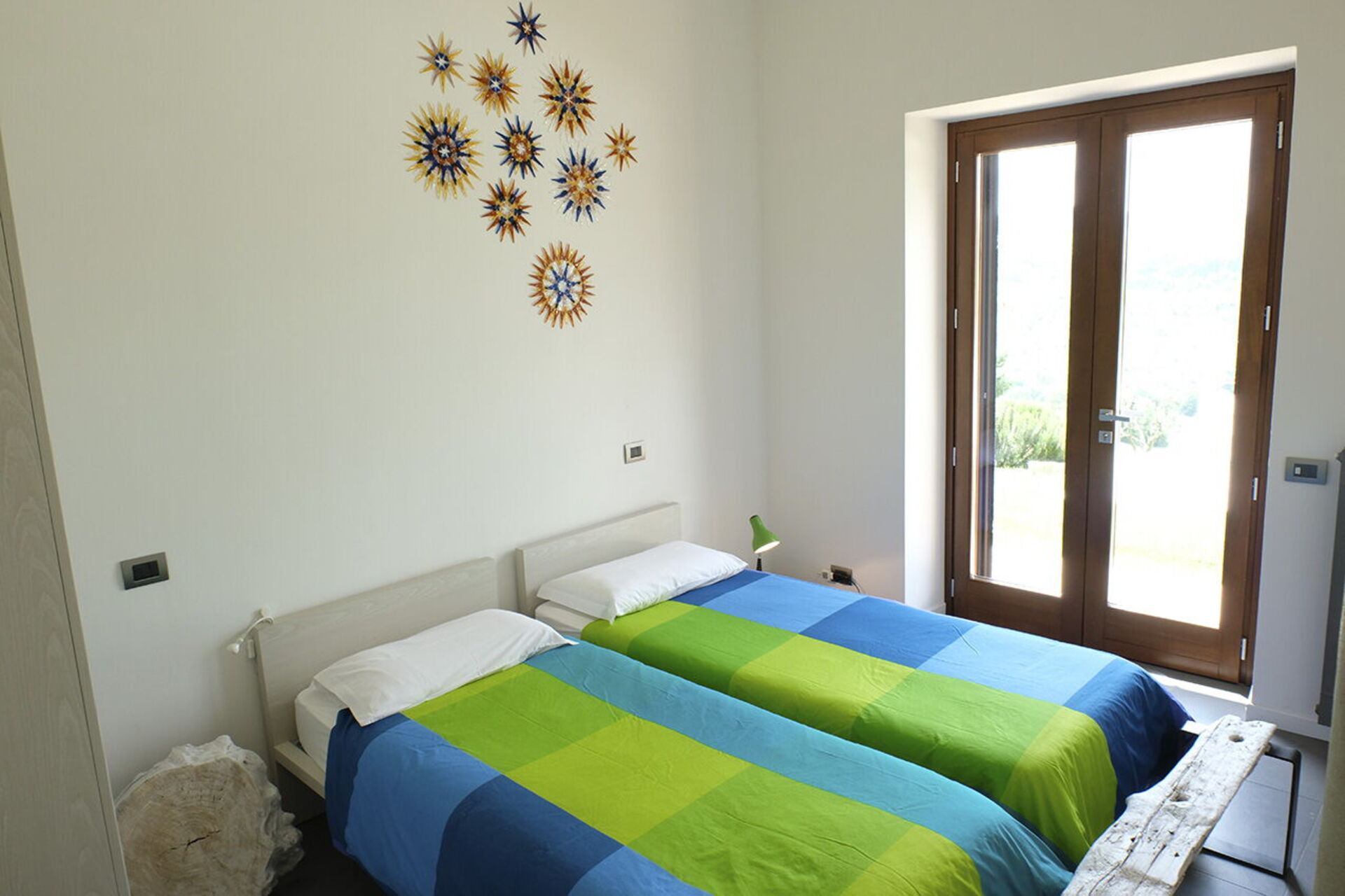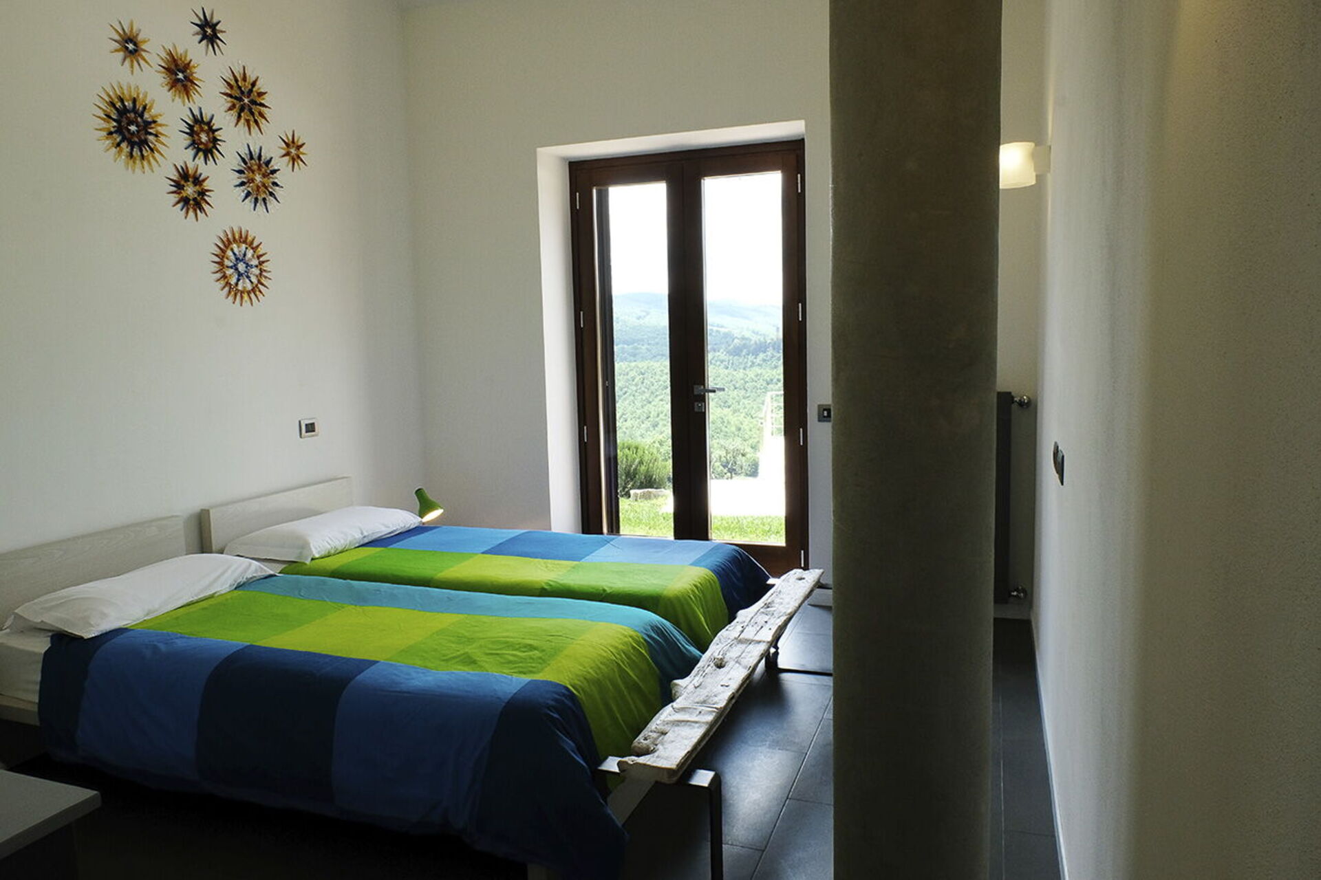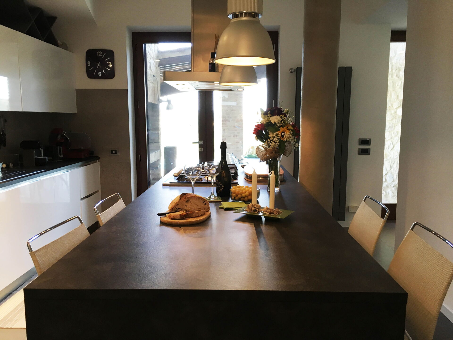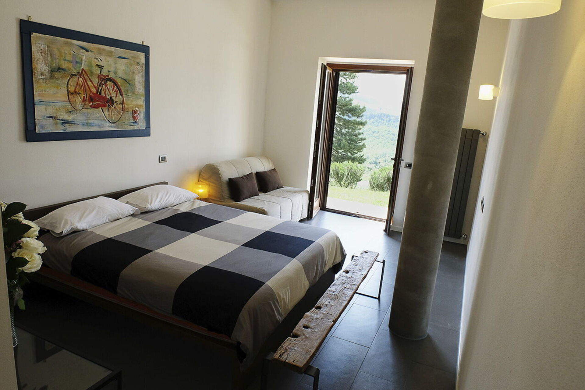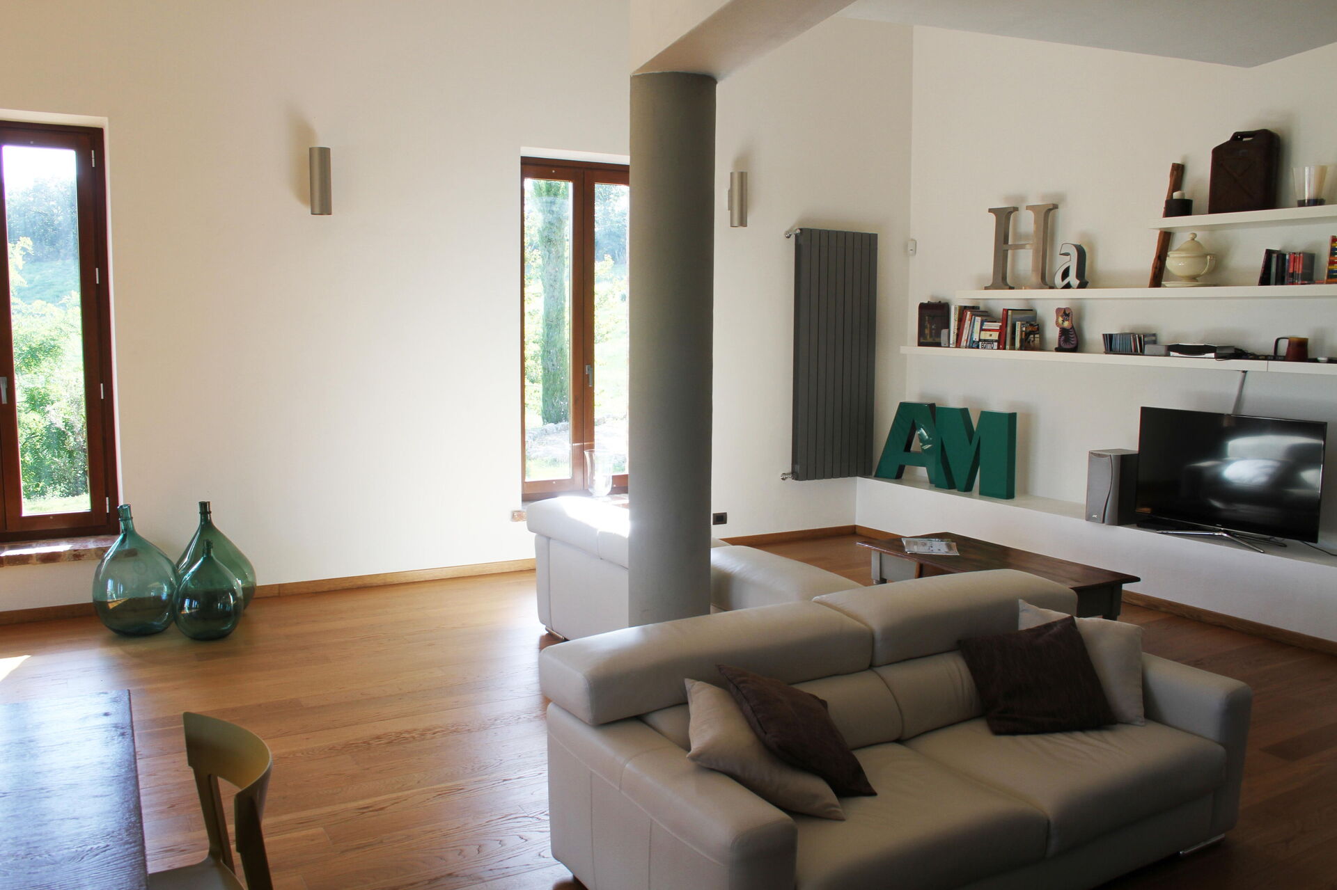 The villa can accommodate up to 10 people, having 4 double bedrooms, one of which also has a sofa bed. The bedrooms are all with king size beds and private bathrooms. A fifth bathroom serves the living area where a large living room with a very particular structure will welcome you. The living room, with two large sofas and a fireplace where you can enjoy a few hours of relaxation even on the coldest days, is a unique construction of its kind where the lines of a large space with very high ceilings are cut by columns and large openings towards the 'external. The many windows offer an enchanting view of the valley where the colors of the foliage of the olive trees and the surrounding hills dominate.