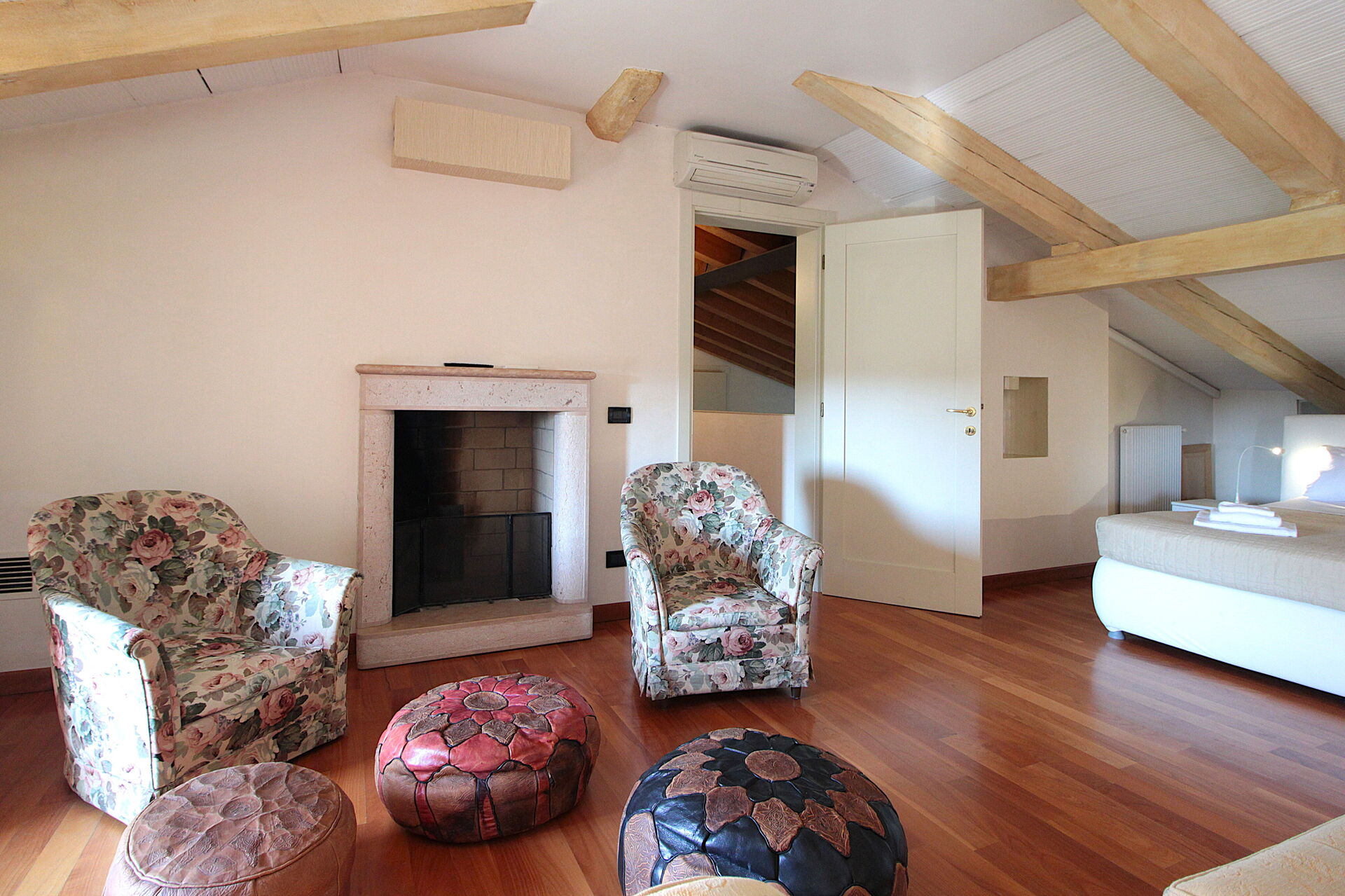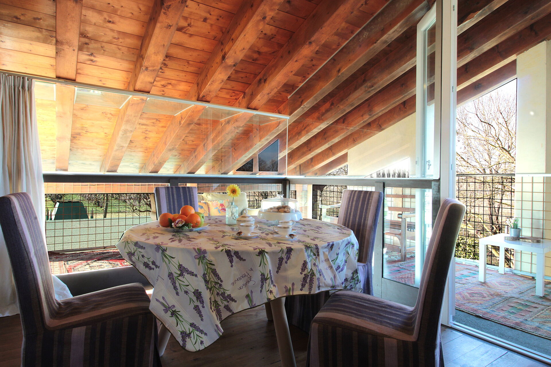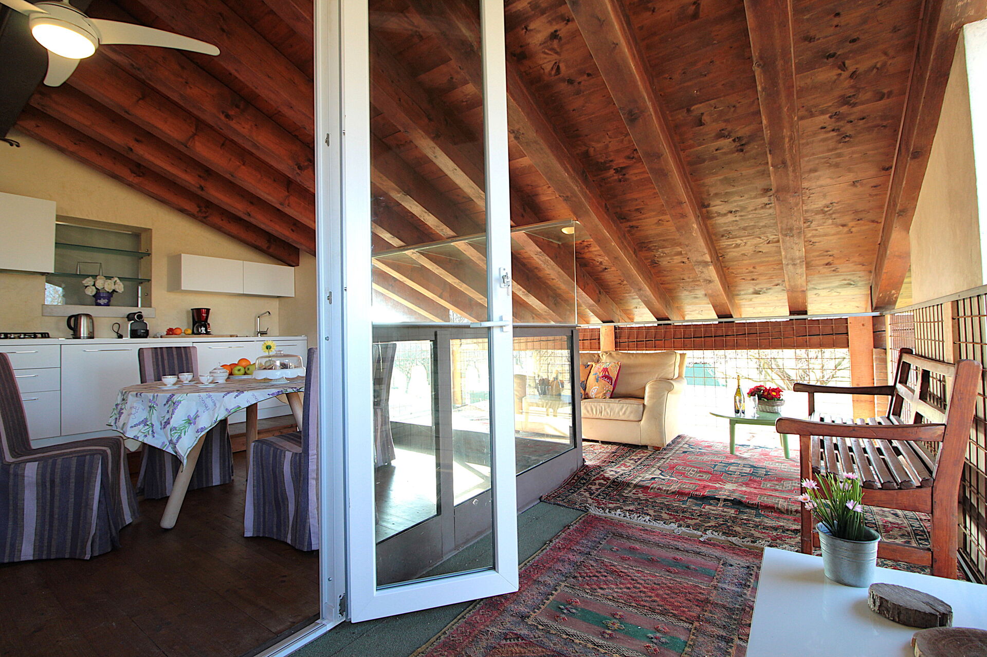 The flat is on the first floor, accessed via an external staircase, and consists of 1 bedroom (with a French bed), a spacious suite (with a small living room with a fireplace, sofa bed and double bed), from which one can access the third bedroom with a French bed, and a large bathroom with bathtub. The kitchen is the most beautiful room, because it is surrounded by glass windows and a balcony where from the sofa you can gaze out over the orchards. On the ground floor, a small sitting room becomes a refuge for reading lovers. The flat is equipped with 2 air conditioning splits, wifi, 1 fan. The flat has a barbecue and private outdoor space.