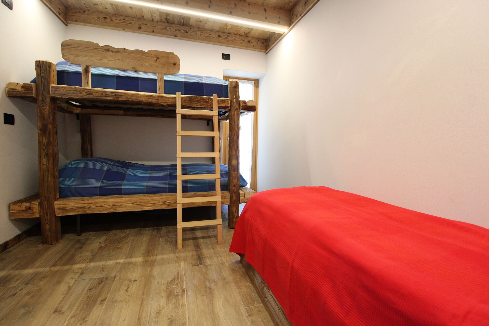 On the lower floor there are two bedrooms, one with a double bed and the other with a bunk bed and a single bed (the double bedroom can also be accessed directly from the outside) and the large bathroom with shower and washing machine.